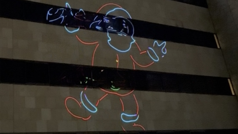 大学建物の壁面に巨大なアニメーションをレーザーにて投影されています。